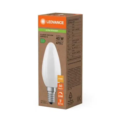 Ledvance Classic LED E14 Bougie Dépolie 2.5W 470lm - 827 Blanc Très Chaud | Dimmable - Équivalent 40W est le produit de remplacement parfait pour votre ancienne ampoule de 40W avec un culot E14 grâce à sa technologie LED. Passer à la LED vous offrira de nombreux avantages !