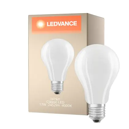 Ledvance Classic LED E27 Poire Filament Dépolie 17W 2452lm - 840 Blanc Froid | Équivalent 150W est le produit de remplacement parfait pour votre ancienne ampoule de 150W avec un culot E27 grâce à sa technologie LED. Passer à la LED vous offrira de nombreux avantages !
