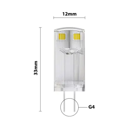 Vous allez bénéficier d'un éclairage durable par rapport à une ampoule halogène G4. Par ailleurs, les LED sont bien meilleures pour l'environnement, car elles ne contiennent pas de substances toxiques. Cependant, nous vous recommandons de comparer la taille de votre ampoule G4 actuelle avec celle de cette ampoule G4 LED. Le diamètre de ce produit est : mm et la hauteur est : 33mm. Vous saurez ainsi avec certitude si cette ampoule s'adaptera ou non à votre appareil.