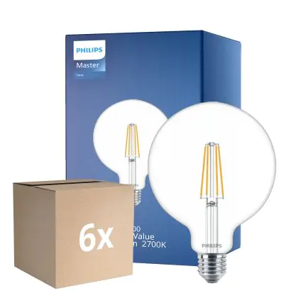 Description Lot 6x Philips MASTER Value LED Globe E27 120mm Filament Claire 5.9W 806lm - 927 Blanc Très Chaud | Meilleur Rendu Des Couleurs - Équivalent 60W