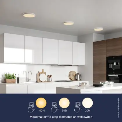 Ce plafonnier Oja de Nordlux montre clairement qu'il est possible d'adapter la lumière. Ce luminaire est doté d'une fonction Moodmaker à trois niveaux, que vous pouvez régler à l'aide de votre interrupteur. Dans ce cas, vous disposez de 3 modes d'éclairage :