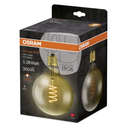 Description Osram Vintage 1906 LED E27 Globe Filament Dorée 125mm 5W 250lm - 820 Blanc Très Chaud | Équivalent 25W