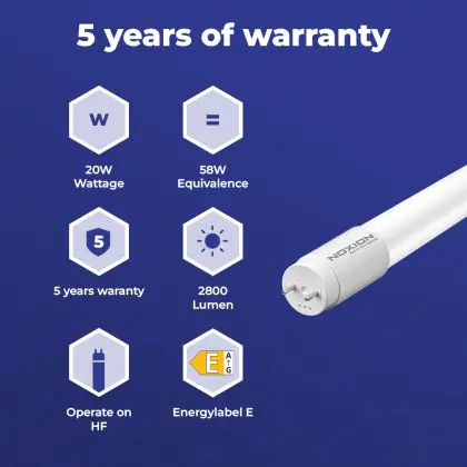 Met Noxion profiteer je van eersteklas T8 LED TL buis verlichting. Waar de TL-voorganger het licht nog rondom verspreidde, straalt deze LED gericht op de plek die verlicht dient te worden. Dat maakt ze een stuk efficiënter in verbruik. Deze specifieke buis gaat gemiddeld 50000 uur mee, en dat zie je terug in de garantieperiode van 5 jaar.