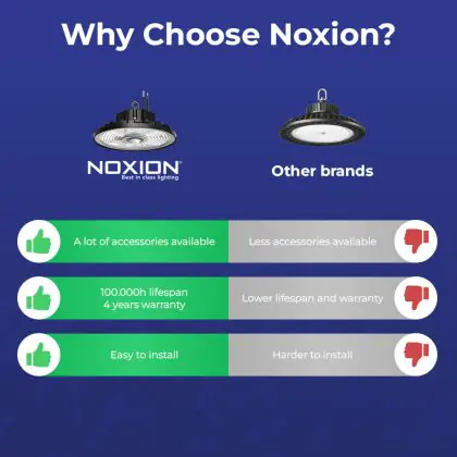 Noxion LED High-bays zijn gemaakt van de beste materialen en beschikken over LED componenten van zeer hoge kwaliteit. Deze Noxion LED High-bay is wat dat betreft geen uitzondering. En dat is onder andere te zien aan de 100000 branduren. Het voordeel van die lange levensduur is dat je na het plaatsen van dit sterke armatuur ruim 16 jaar (bij een verbruik van 60 uur per week) geen omkijken meer hebt naar deze LED verlichting. En dat scheelt weer in onderhoudskosten of het huren van een installateur en/of hoogwerker. Ook is aan het vermogen van 100 Watt goed te zien dat dit Noxion klokarmatuur vele malen zuiniger is dan conventionele high-bay verlichting. Oftewel: je bent verzekerd van een mooie energiebesparing, die kan oplopen tot 80%!