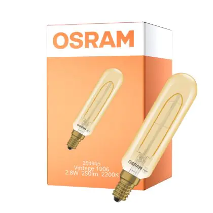 Beschrijving Osram Vintage 1906 LED Special Shapes E14 Tubular Amber 2.8W 250lm - 822 Zeer Warm Wit | Dimbaar - Vervangt 25W